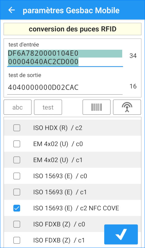 Gesbac Mobile dispose de fonctions permettant de convertir le code RFID lu vers le code en clair. Dans le cas d’un parc hétérogène de puces RFID de différents fournisseurs, Gesbac Mobile est à même de récupérer la bonne information et de la retranscrire dans le format enregistré dans le logiciel ou indiqué sur l’étiquette associée.