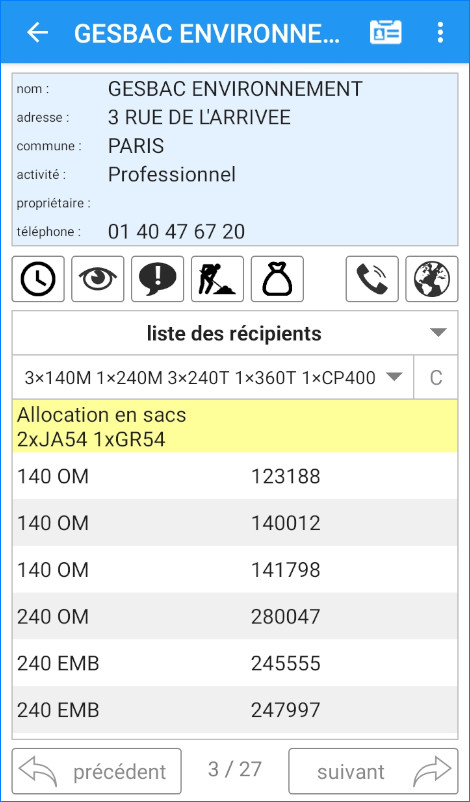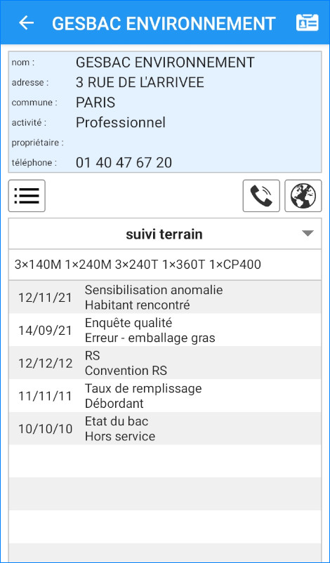 Le module logiciel de suivi terrain ainsi que l’application mobile associée permettent aux équipes intervenant sur le terrain de consulter, de vérifier et d’enregistrer rapidement diverses informations concernant le parc de récipients et la qualité de collecte. L’application vous permet aussi une gestion dématérialisée des interventions et des ordres de service.