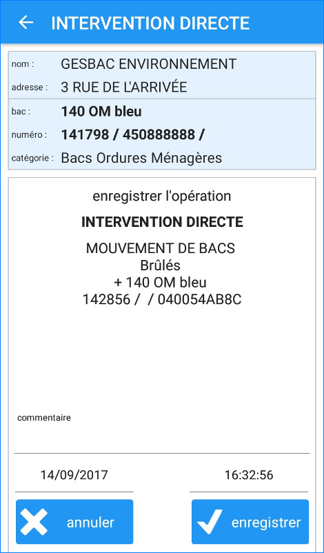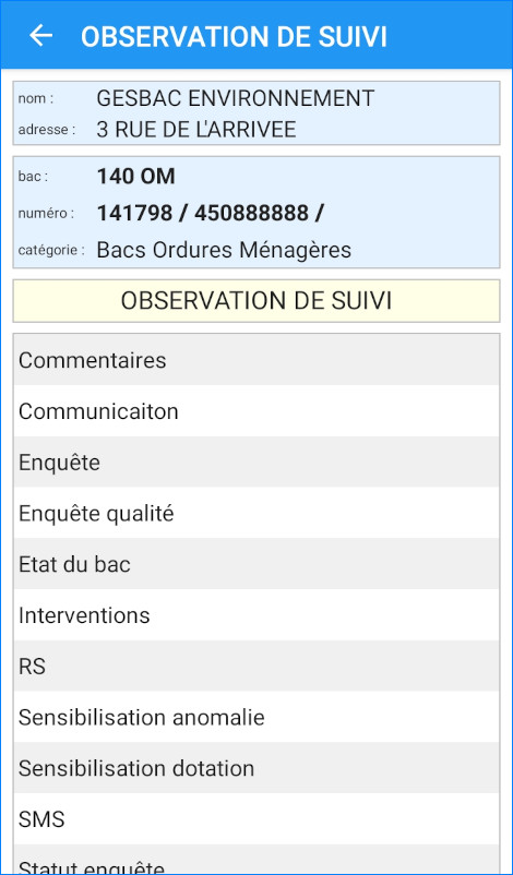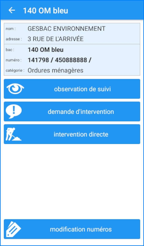 Gesbac Mobile vous permet de saisir des relevés terrain concernant un bac ou un emplacement, de demander une intervention, d’enregistrer une intervention réalisée directement par une équipe sur place ou de modifier les identifiants d’un bac.