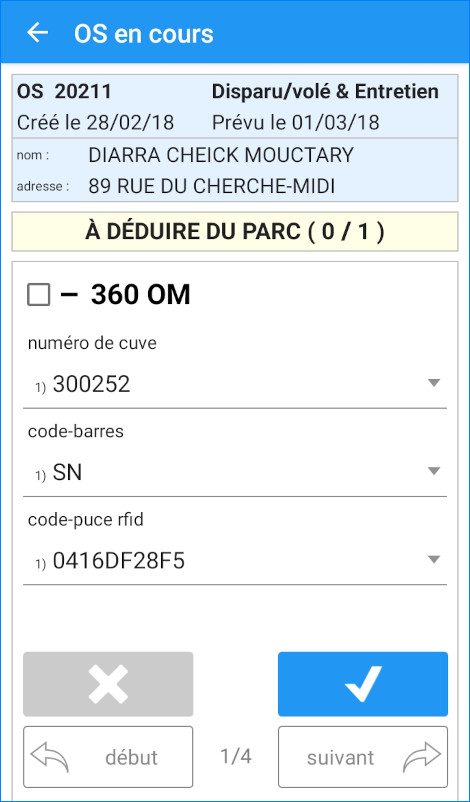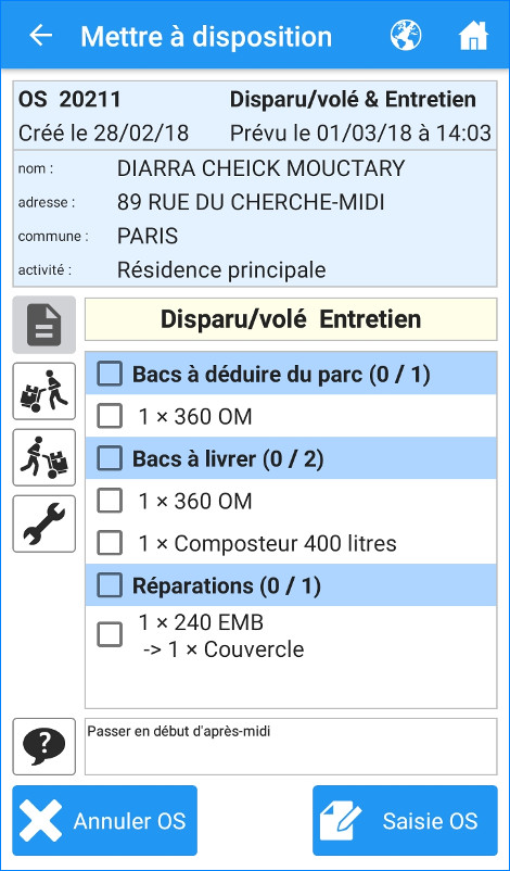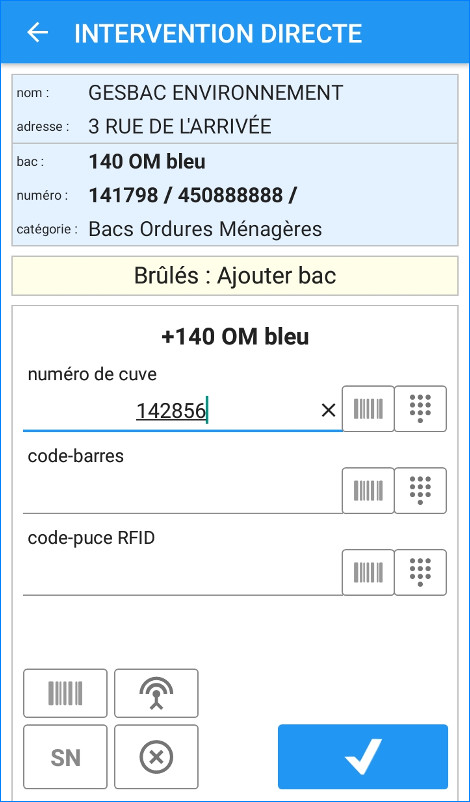 Sur le terrain, vos agents peuvent accéder aux données d’un usager ou d’un bac par l’adresse, le numéro de cuve, le code-barres, le code-puce ou l’ordre de service.