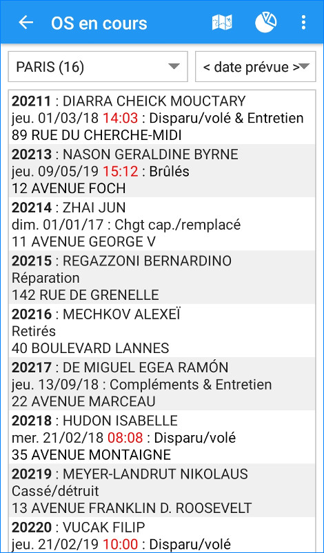 Chaque appareil peut être associé à une équipe terrain. De cette façon, les agents n’ont accès qu’aux OS qui leur sont attribués. Les ordres de services peuvent aussi être filtrés par commune ou par date prévue d’intervention.