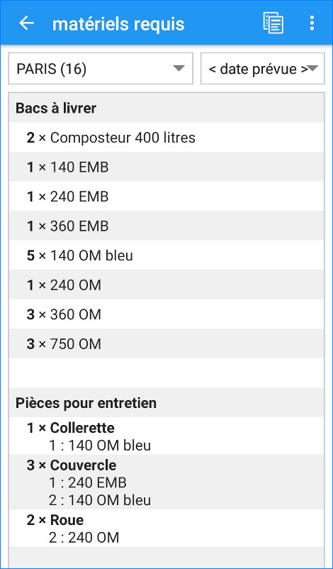 Cette fiche vous permet de consulter la liste des bacs en place ainsi que les bacs hors service, notamment ceux déclarés disparus ou volés. Vous pouvez, de plus, filtrer la liste des bacs par modèle, par catégorie ou par flux de collecte.