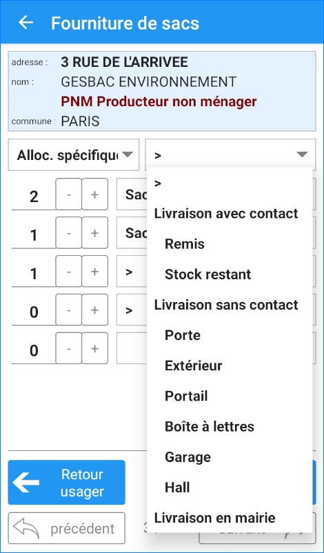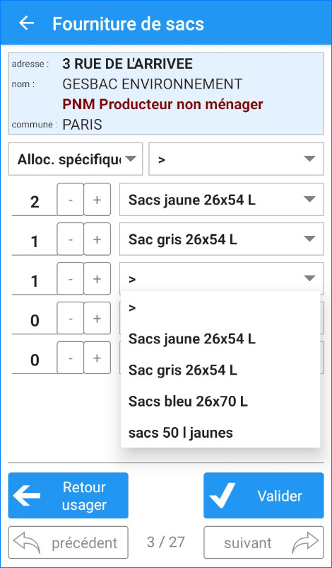 Adossé au module de gestion des sacs, les agents peuvent distribuer les rouleaux de sacs de précollecte ou de sacs payants selon l’allocation prévue ou, selon les droits donnés à l’utilisateur, forcer une dotation particulière.