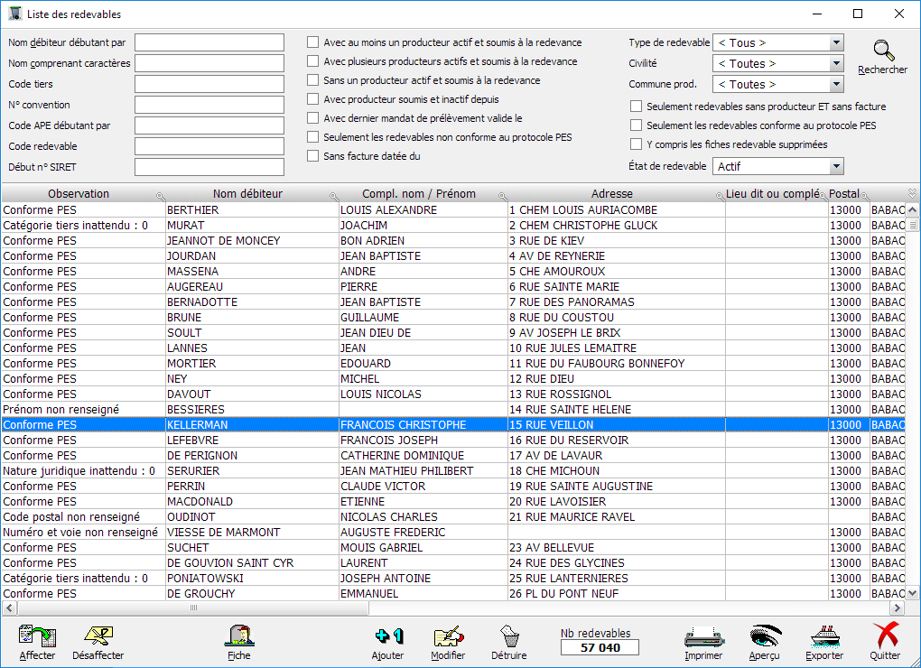 Un clic sur le bouton Redevable permet de mettre à jour la fiche du débiteur en conformité avec le protocole PES du Trésor Public :