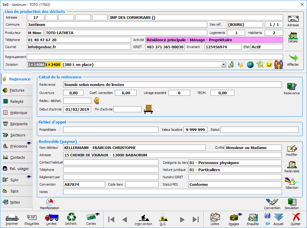 L’ensemble des données concernant un producteur de déchets (un usager) se trouvent facilement dans une seule fenêtre (voir l’exemple ci-dessous) qui comprend quatre zones principales allant de haut en bas :