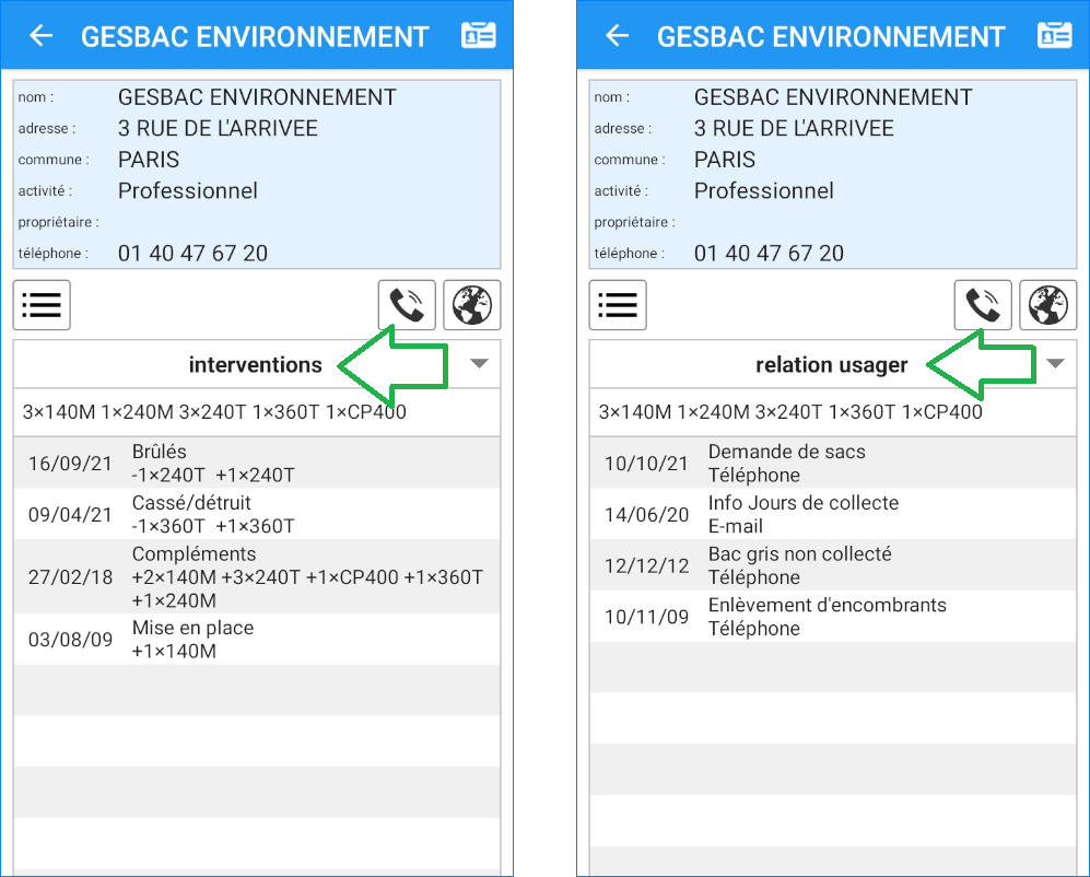 - Gesbac Mobile : Navigation entre les fiches usagers, selon les filtres des emplacements (activité, côté de voie...).