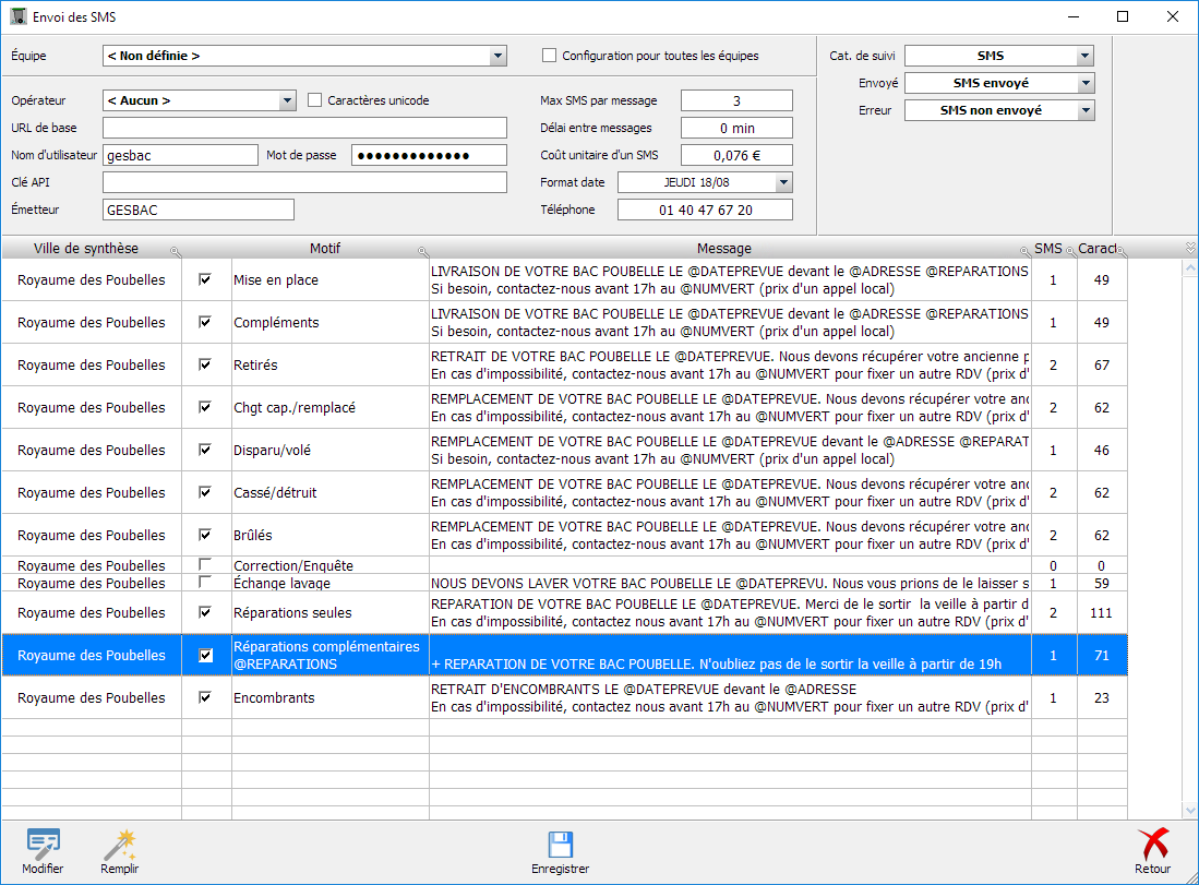 De la même façon, les messages-type peuvent être configurés par équipe intervenante (prestataires, régie, etc.). L’opérateur de SMS et sa configuration sont ainsi paramétrés par équipe d’intervention ou sans distinction.