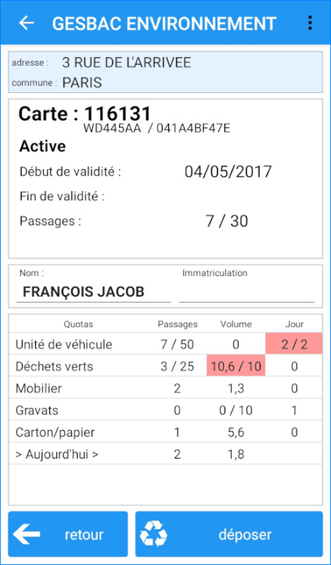 - Les quotas annuels par catégorie de déchet et par type de comptage (en passages ou en volume), sur fond rouge ou vert selon le paramétrage