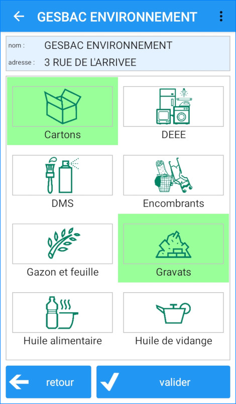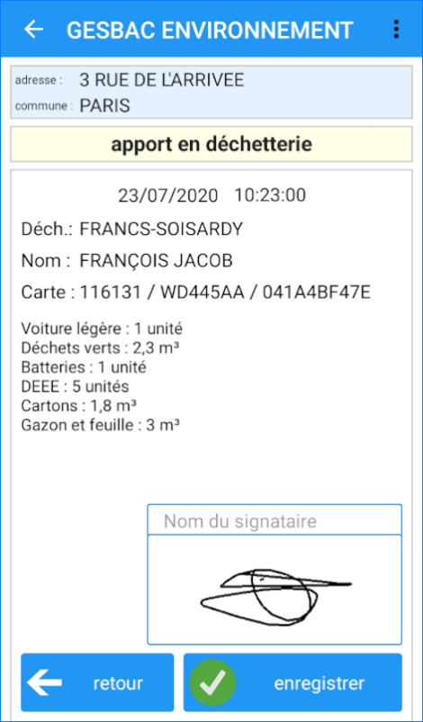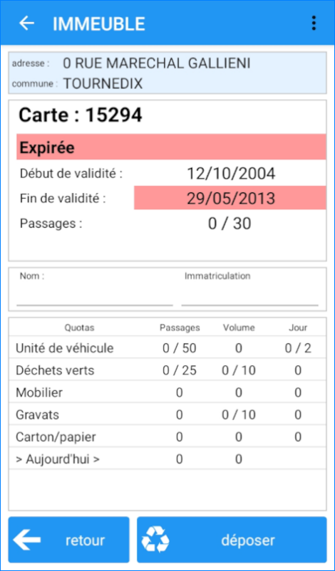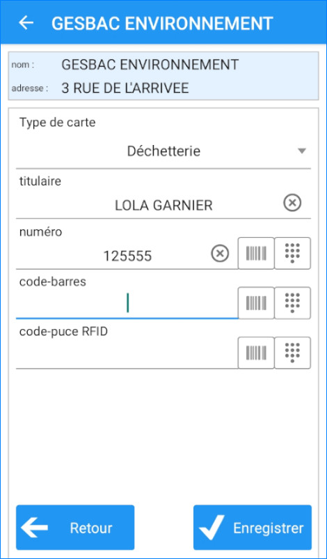 Les gardiens ou les déchetteries peuvent être équipés de terminaux portables. Nous proposons alors l’application mobile pour Android ou Windows Mobile/CE. Cette application permet aux agents de saisir les dépôts des usagers en notant le numéro de carte, en scannant le code-barres, le code-puce RFID, NFC ou en accédant à l’adresse du déposant.