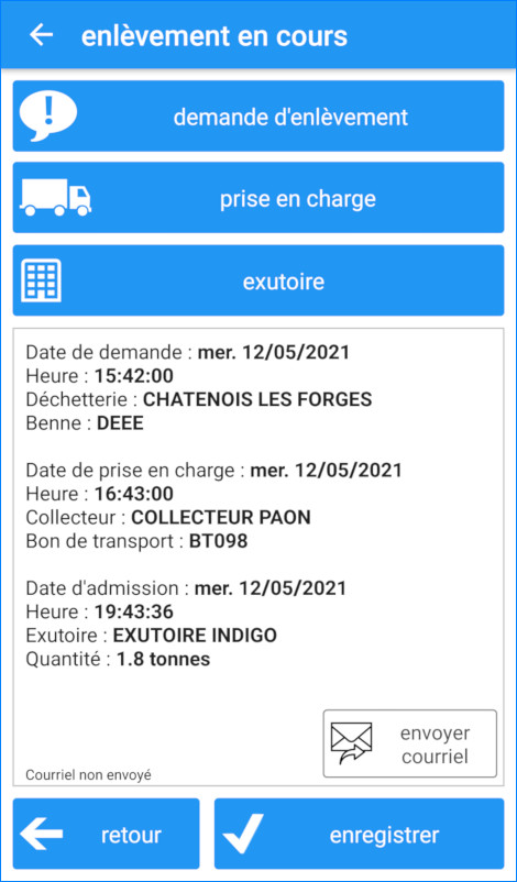 Les demandes d’enlèvements sont saisies dans le logiciel principal ou sur les terminaux portables. Elles sont ensuite closes par l’enregistrement de la date d’enlèvement et du tonnage constaté.