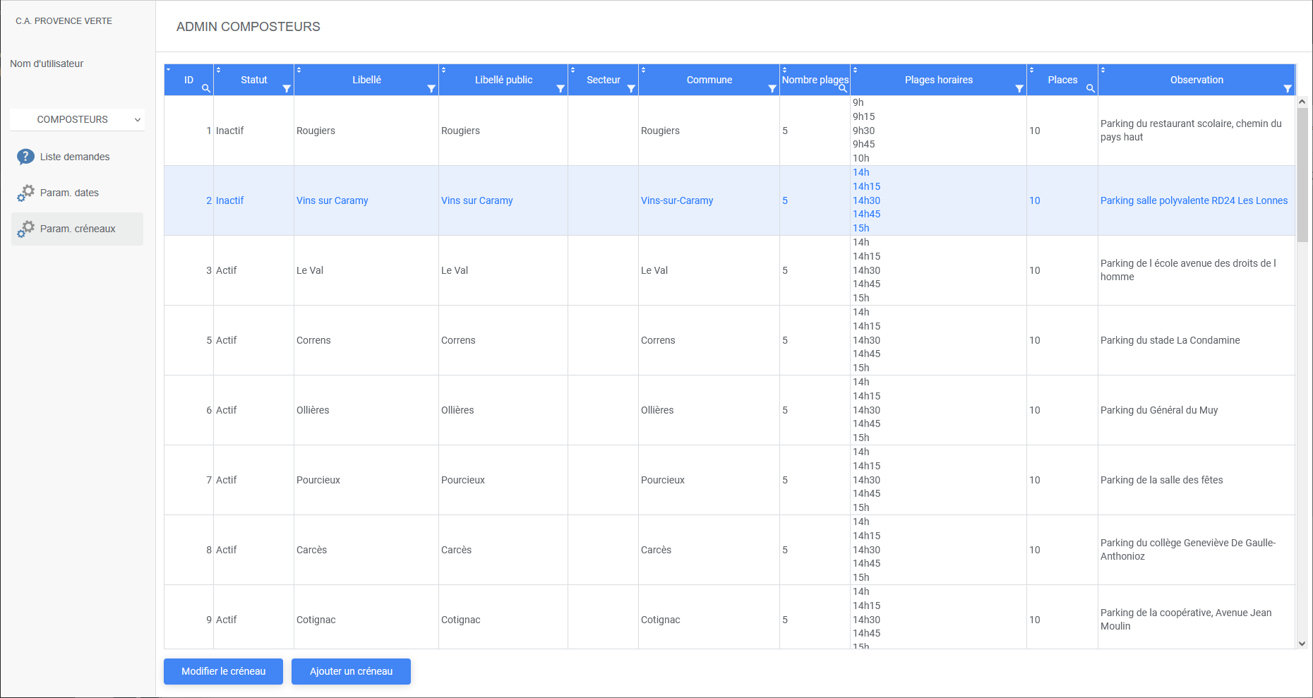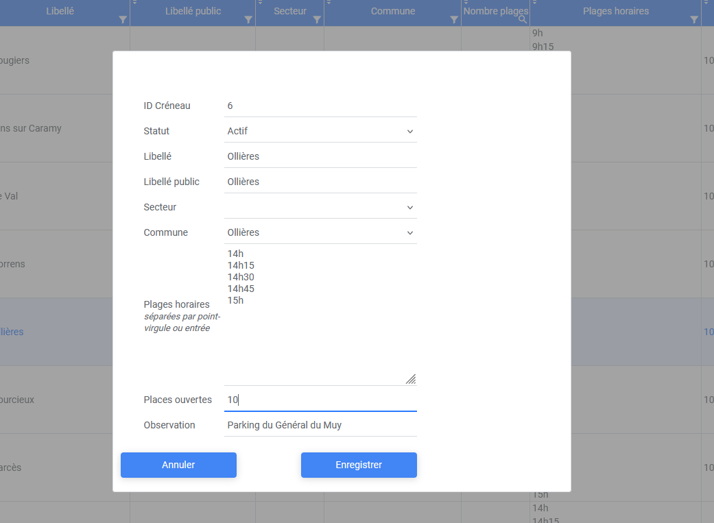- Paramétrage des créneaux et lieux de fourniture