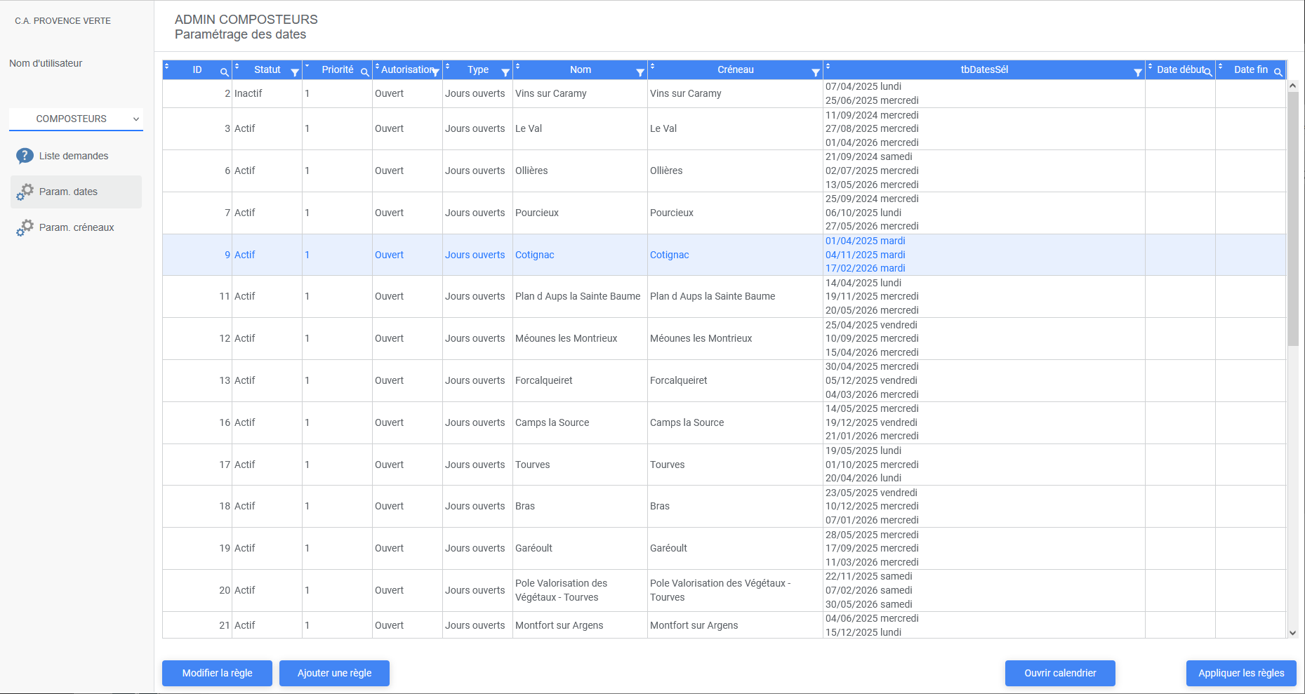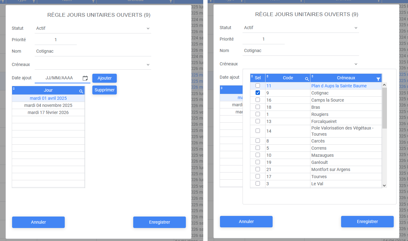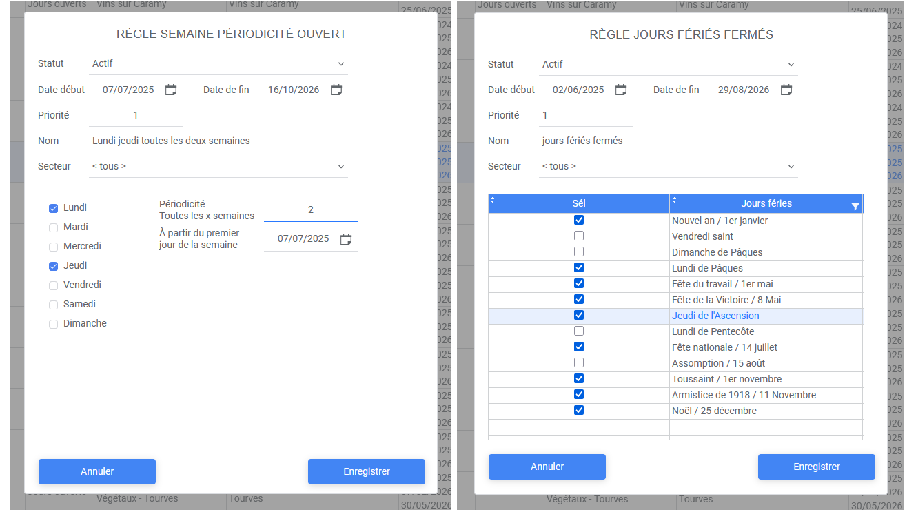 L’application permet de gérer un calendrier des dates d’ouverture selon différentes règles parmi lesquelles :